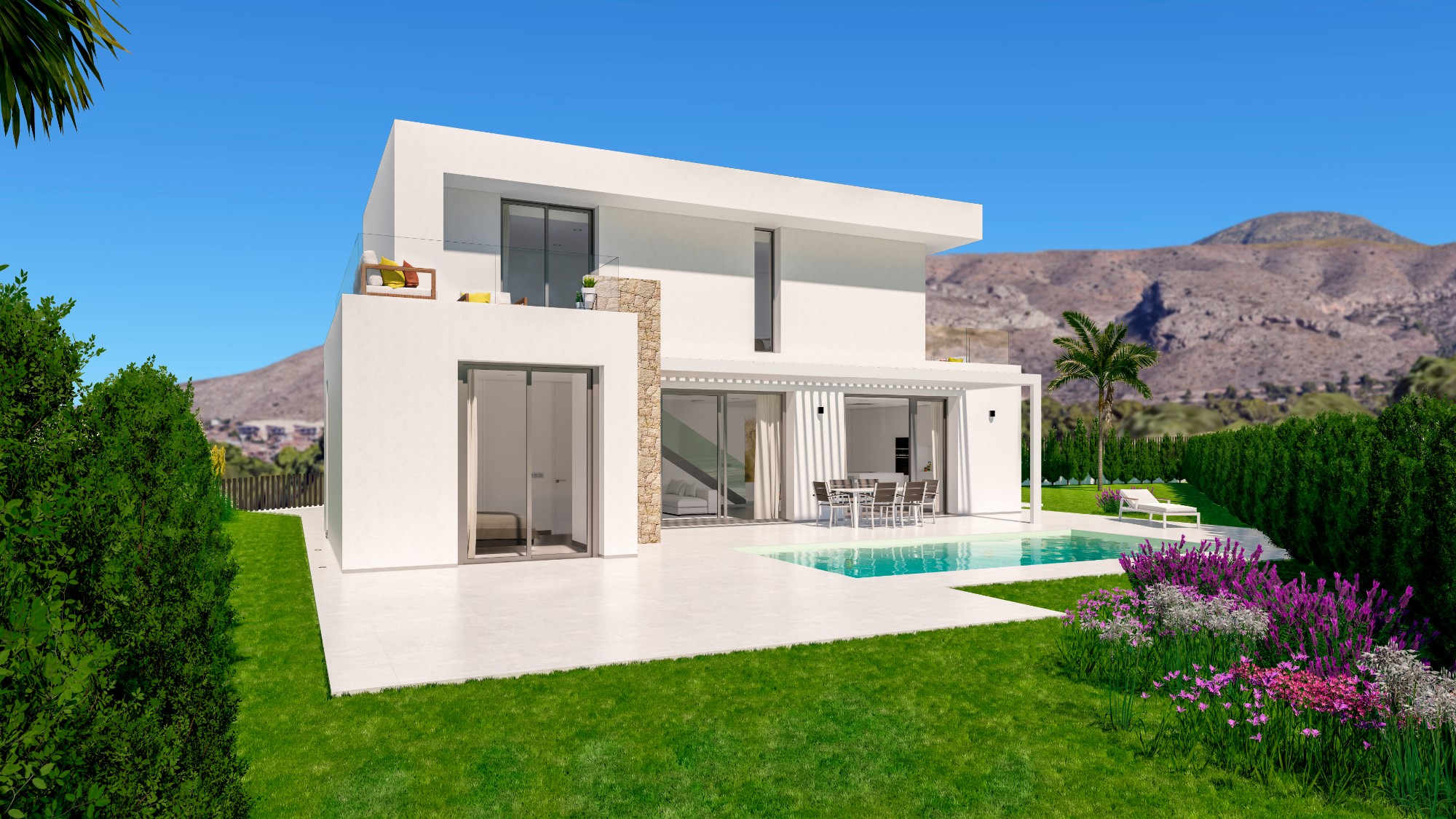 Construcción de nuevas villas de lujo de Sierra Cortina. Estas exclusivas villas con vistas al mar se caracterizan por un diseño impresionante y unas comodidades inigualables.